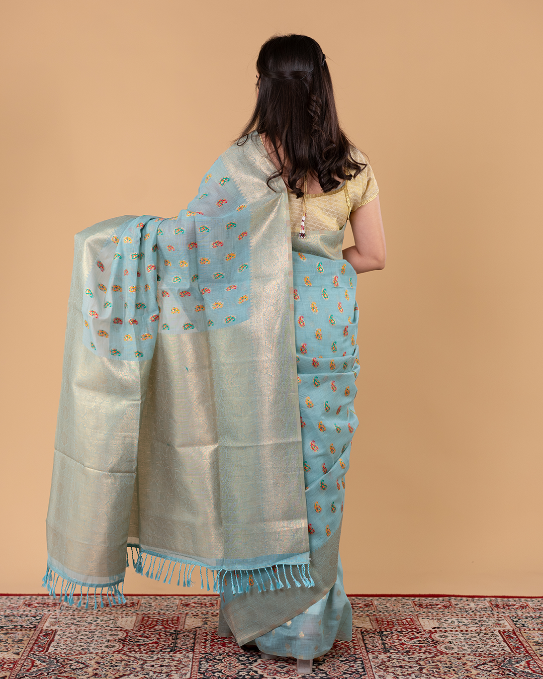 Embrace timeless elegance with this Handwoven Motif Saree with Soft Gold Border – Elegant Ethnic Wear, designed for women who appreciate subtle luxury and traditional craftsmanship. The soothing sky blue base is beautifully adorned with delicate ethnic motifs woven across the body, giving the saree a refined yet graceful appeal.