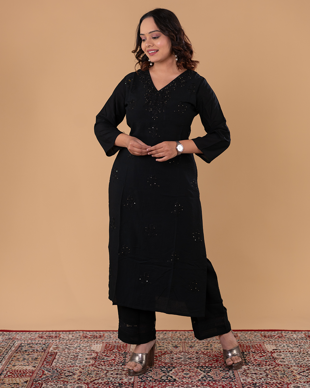The straight-cut silhouette offers a comfortable yet polished look, making it ideal for office wear, evening outings, festive get-togethers, or elegant daily styling. Paired with matching straight pants, this versatile black kurti set is a timeless wardrobe essential that transitions seamlessly from day to night.
