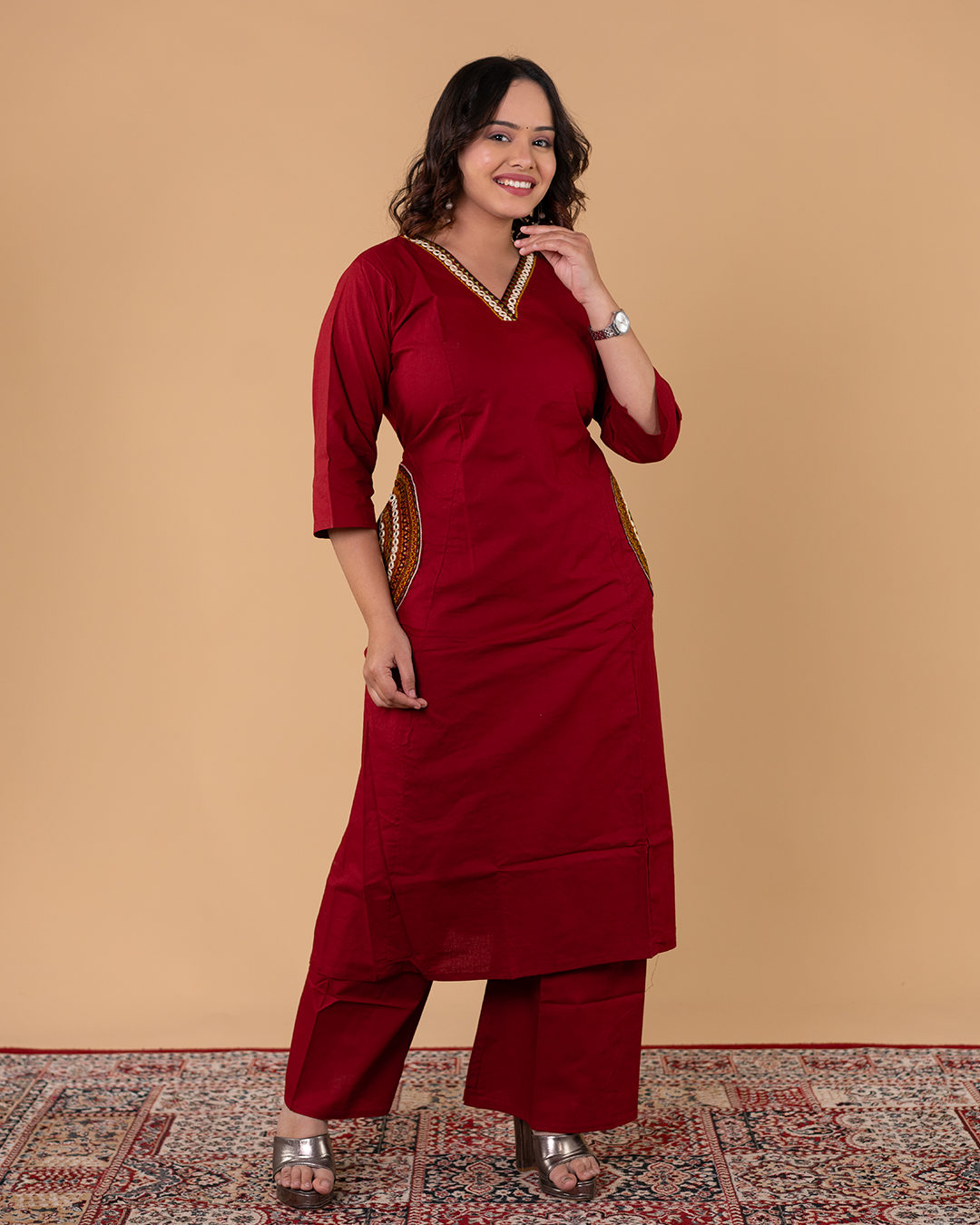 Maroon Solid Kurta Set with V-Neck & Subtle Embellished Detailing