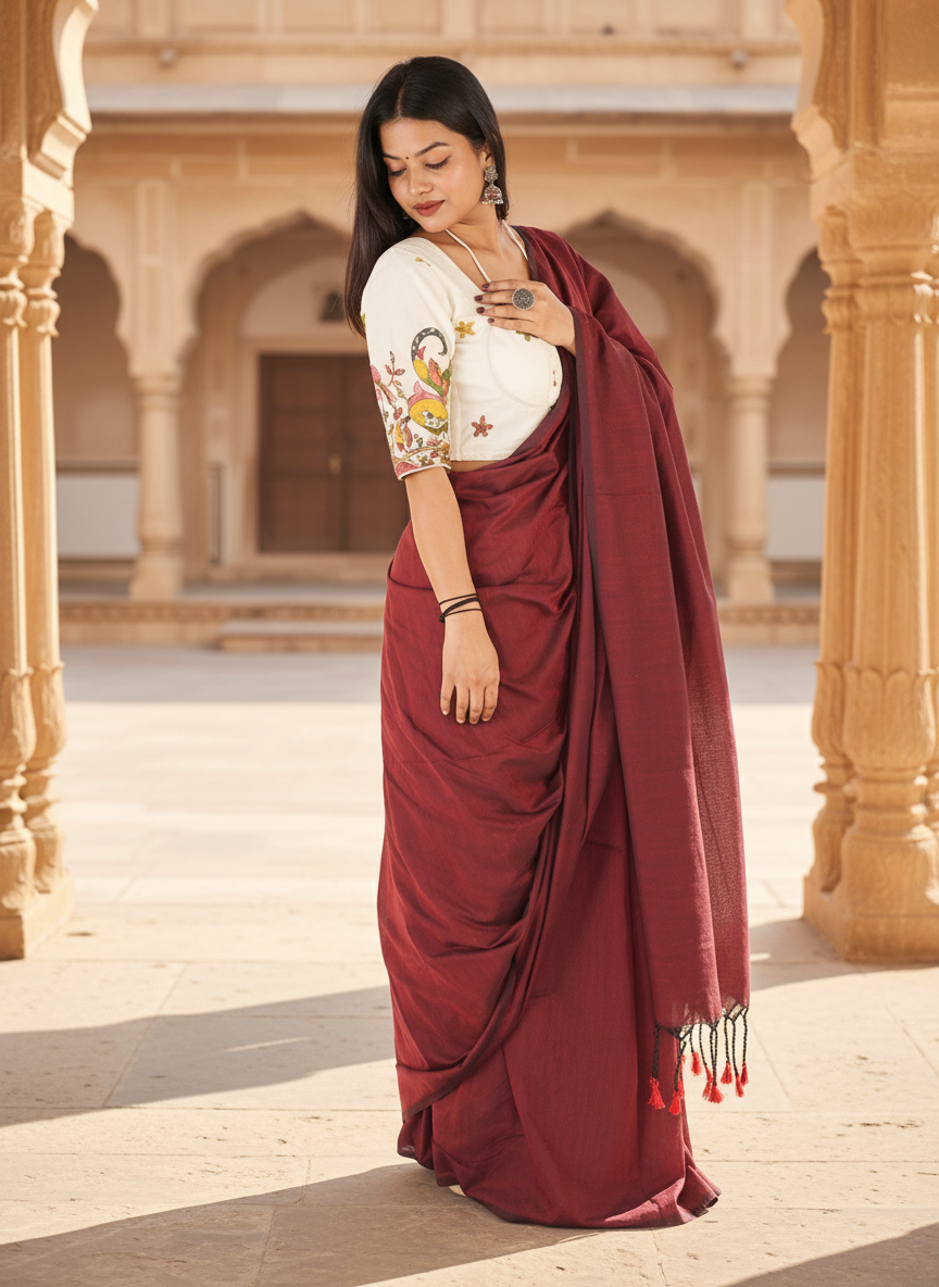 Experience timeless elegance with this Wine Maroon Khadi Cotton Saree, thoughtfully designed for women who appreciate comfort, craftsmanship, and classic style. Made from breathable khadi cotton, this saree offers a soft texture and graceful fall, making it ideal for all-day wear.
