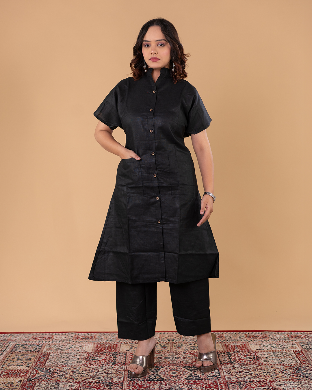 Classic Black Solid Button-Down Kurti Set with Straight Pants