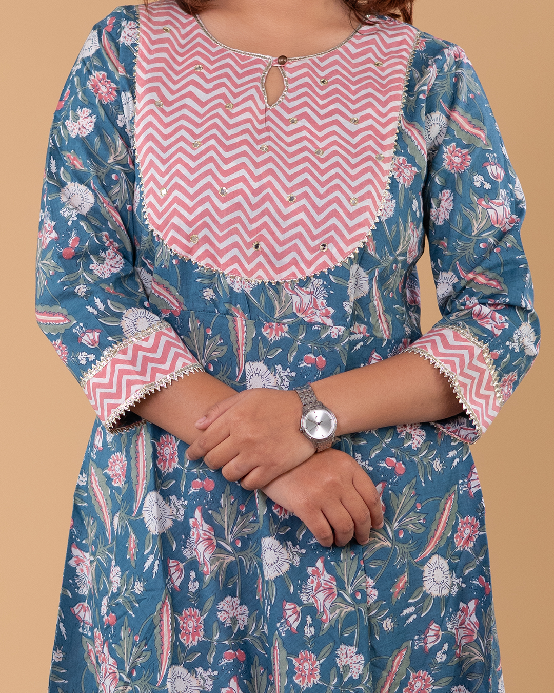 Refresh your ethnic wardrobe with this elegant Teal Blue Floral Printed Kurta Set, designed for everyday comfort with a stylish twist. The kurta features an all-over floral print enhanced by a contrasting chevron-patterned yoke in soft pink tones, adding a contemporary ethnic appeal.